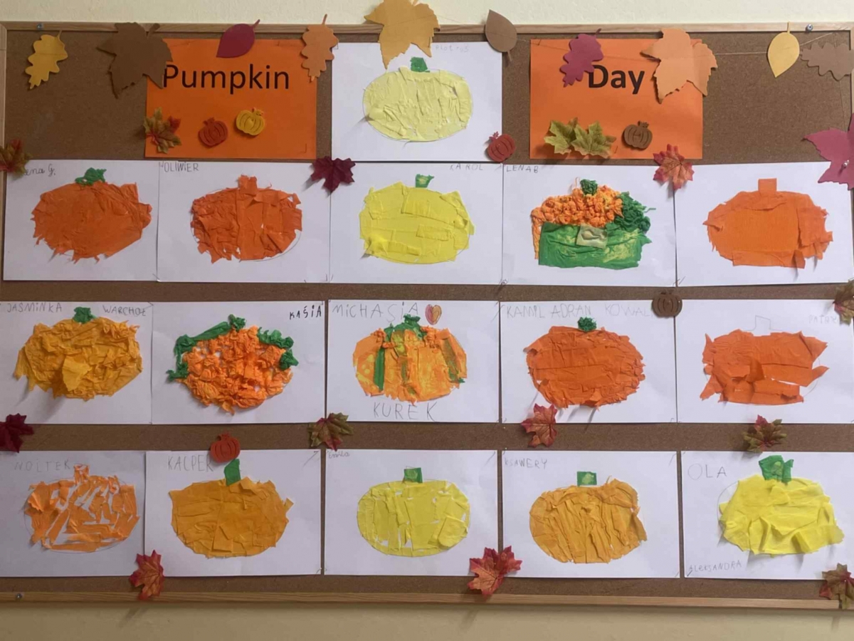 Jesień w naszej szkole nie może obyć się bez dyni! Już tradycyjnie, październikowe dni wypełniają się pomarańczowym kolorem, kreatywnymi pomysłami i radosną atmosferą. Był kiermasz, akcja czytelnicza, konkurs na najładniejszą dynię, a młodsze klasy miały wyjątkowe zajęcia języka angielskiego, które połączyły naukę z jesienną zabawą. Dynia stała się motywem przewodnim, a dzieci miały okazję rozwijać swoje umiejętności językowe, matematyczne i manualne w atmosferze radości i kreatywności.